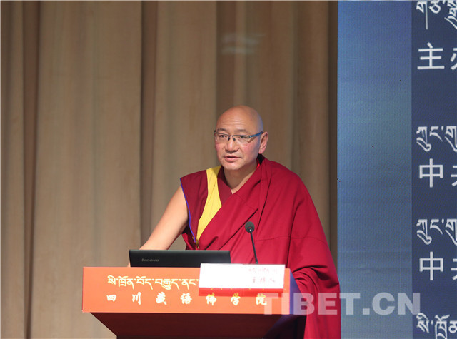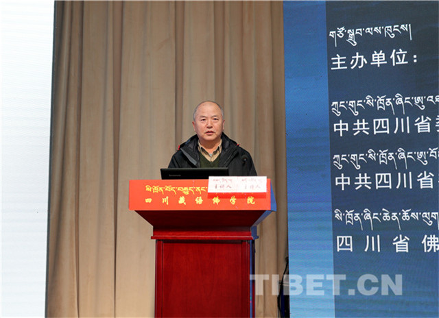图为四川省佛教协会副会长、四川藏语佛学院院长甲登•洛绒向巴致辞并宣布开幕。