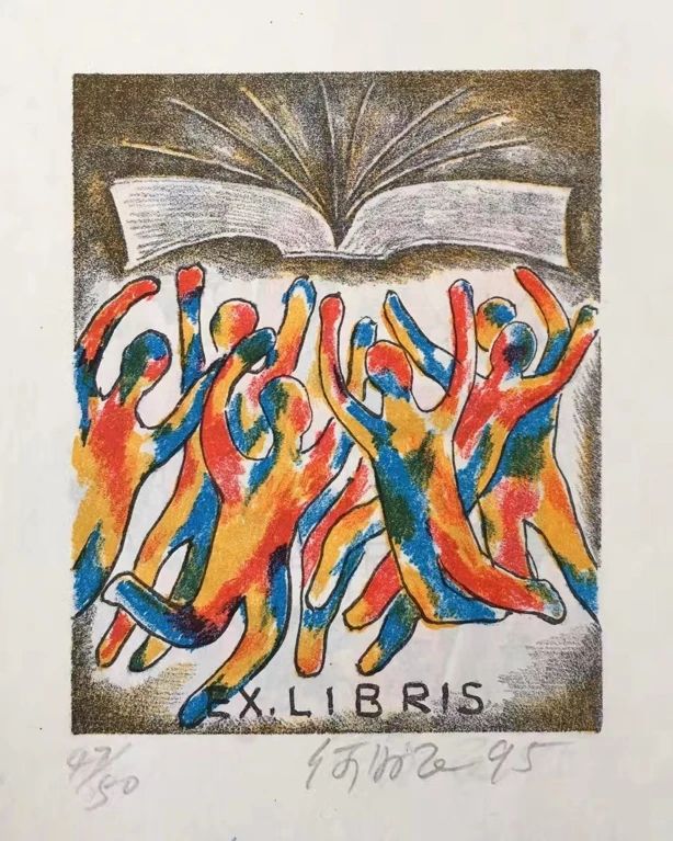 何为民创作的套色石版画藏书票,该作品曾获全国第六届藏书票展银奖。受访者供图