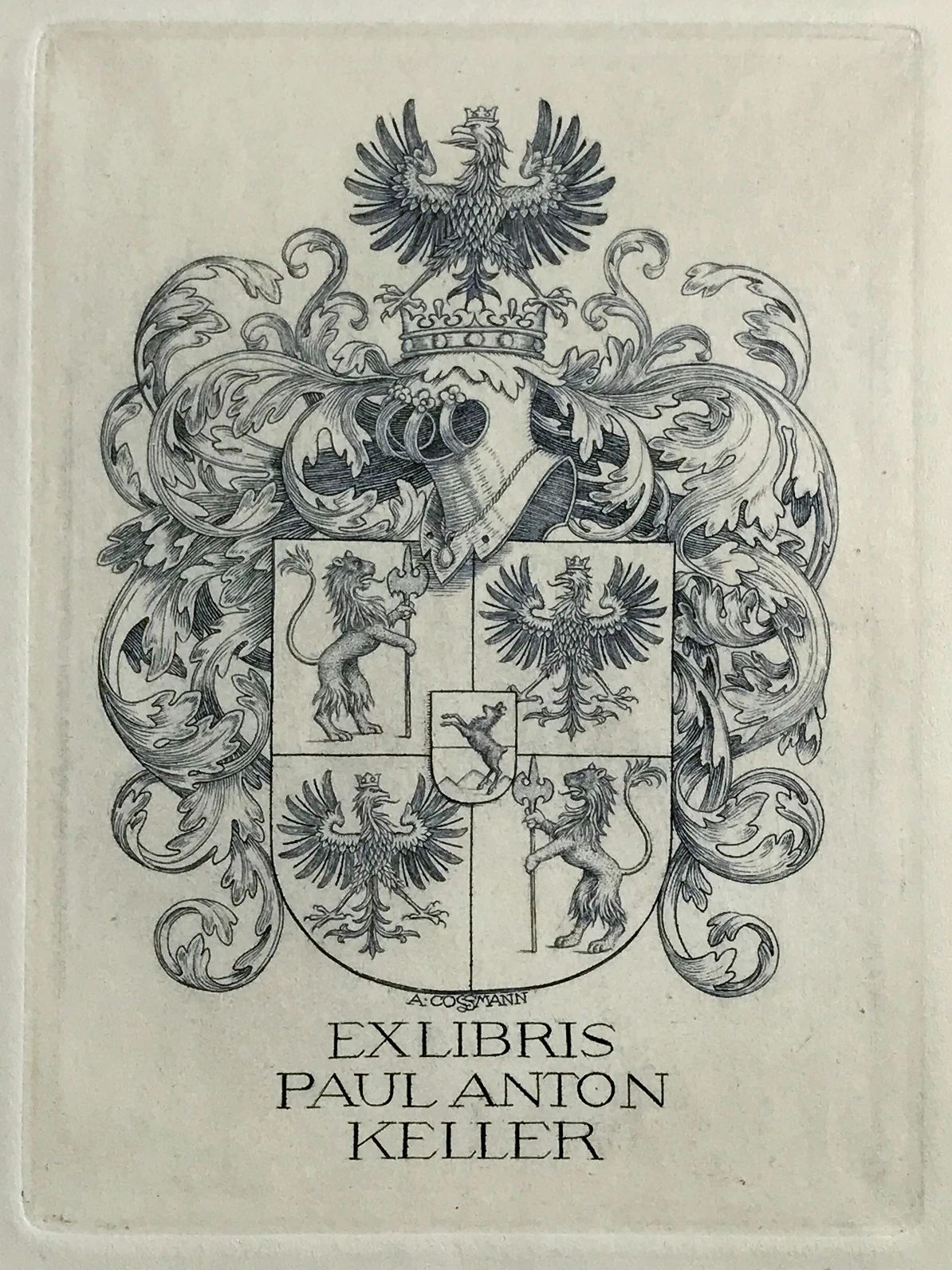 何为民收藏的纹章藏书票,作者是奥地利版画家阿尔弗雷德-科斯曼 (Alfred Cossmann 1870-1951) 。受访者供图