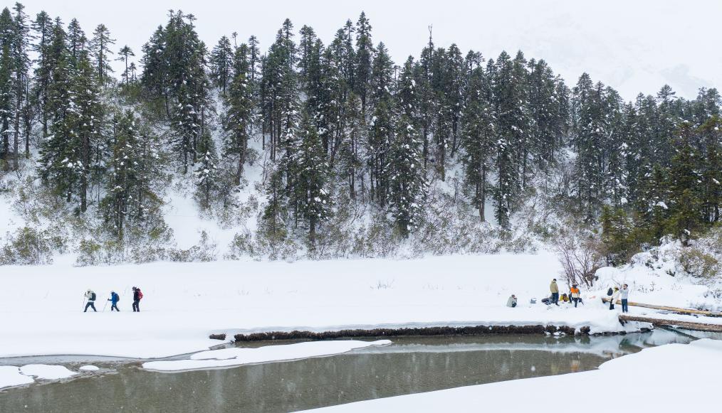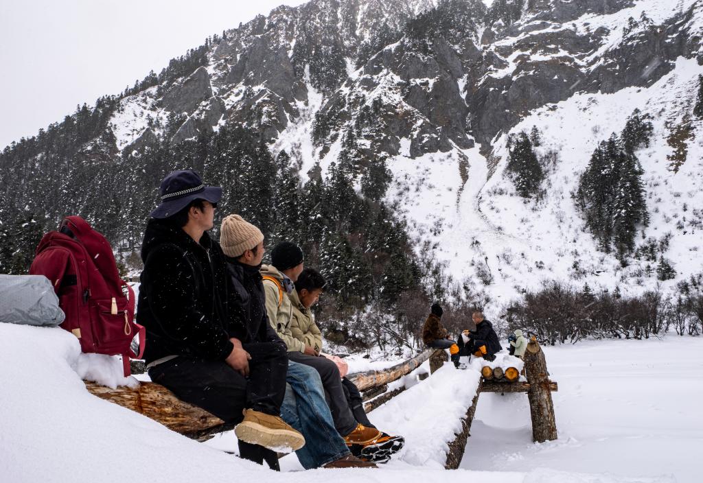 游客们一路走走停停,拍照、驻足、感叹。因风雪较大,到牧场的2公里路就走了整整一小时。但没有人放弃,也没有人觉得遗憾——白普隆沟的美,不在于抵达终点,而在于每一步都有惊喜。