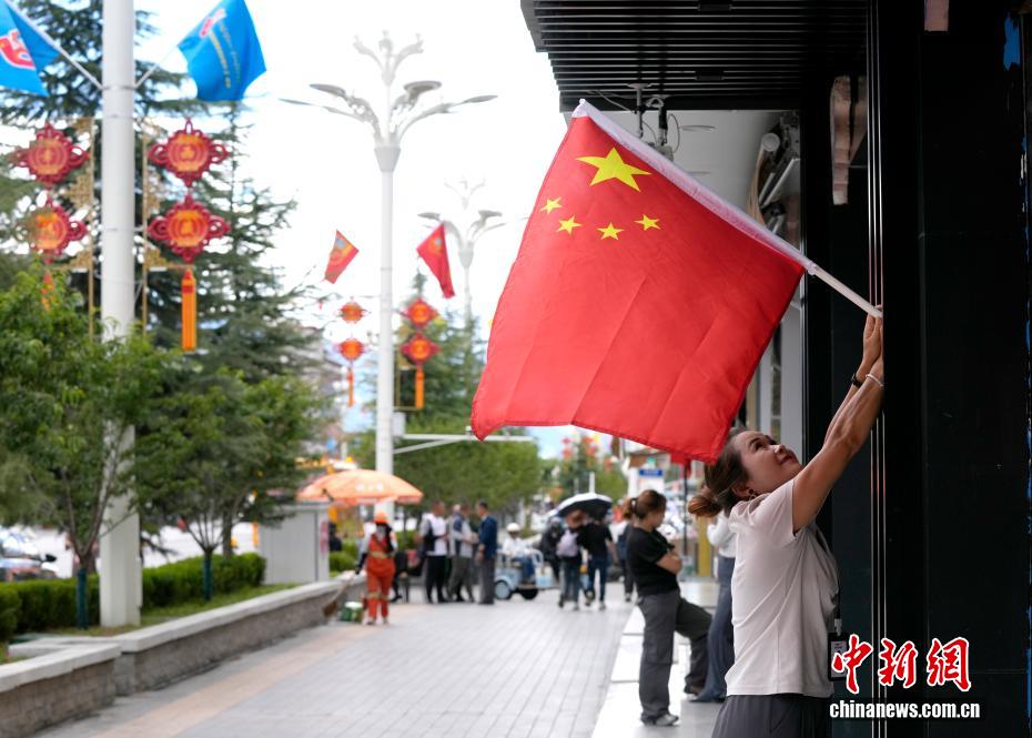 8月19日,随着西藏自治区成立60周年庆祝活动临近,拉萨氛围浓。拉萨街头,处处是张灯结彩的盛景,洋溢着一派祥和与欢腾的氛围。图为拉萨北京中路商铺悬挂国旗。