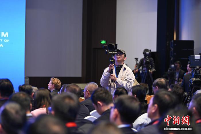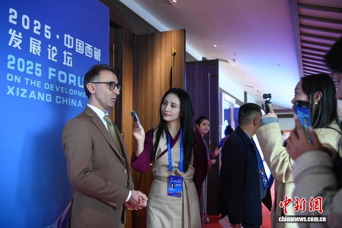 10月29日,“遇见美丽西藏 书写雪域新篇”为主题的2025·中国西藏发展论坛在林芝开幕。来自40多个国家和地区的400多名中外嘉宾参会。图为藏族记者采访外国嘉宾。中新社记者 贡嘎来松 摄