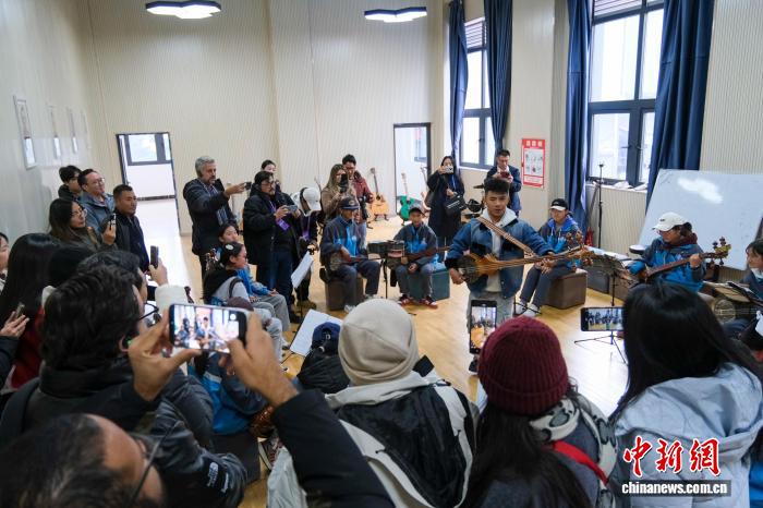 10月28日,拉美18个国家的21名记者、编辑等媒体从业者在西藏自治区林芝市巴宜区中学参访,观看师生们演奏藏族扎念琴。中新社记者 江飞波 摄