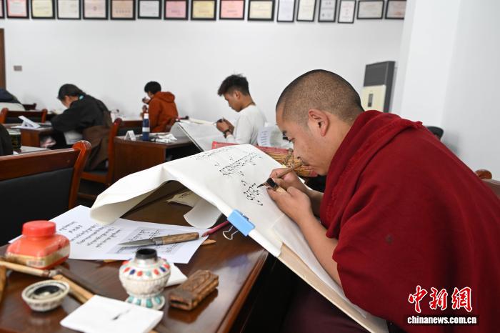 11月23日,第二届“工巧杯”西藏工艺美术中青年高技能人才技艺大赛现场实操技能在拉萨市唐卡艺术博物馆开赛。本次大赛以“薪火相传 守正创新”为主题,由284名选手来自西藏6(市)地的42个县(区),涵盖唐卡、雕塑、编织等36类工艺。据悉,西藏工艺美术行业现有2700余家市场主体、3.7万余名从业者,2024年产值超30亿元(人民币)。图为参赛选手在写藏文书法。中新社记者 贡嘎来松 摄