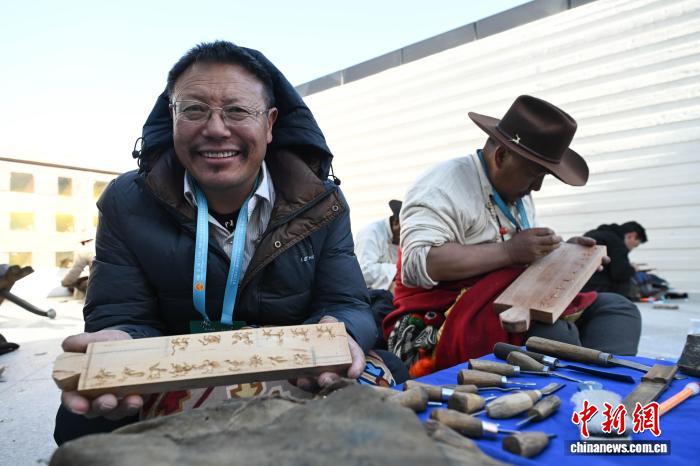 11月23日,第二届“工巧杯”西藏工艺美术中青年高技能人才技艺大赛现场实操技能在拉萨市唐卡艺术博物馆开赛。本次大赛以“薪火相传 守正创新”为主题,由284名选手来自西藏6(市)地的42个县(区),涵盖唐卡、雕塑、编织等36类工艺。据悉,西藏工艺美术行业现有2700余家市场主体、3.7万余名从业者,2024年产值超30亿元(人民币)。图为参赛选手展示木雕作品。中新社记者 贡嘎来松 摄