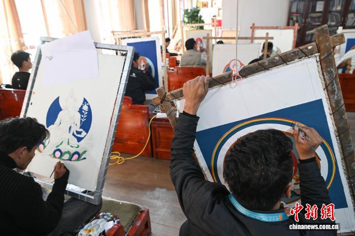 11月23日,第二届“工巧杯”西藏工艺美术中青年高技能人才技艺大赛现场实操技能在拉萨市唐卡艺术博物馆开赛。本次大赛以“薪火相传 守正创新”为主题,由284名选手来自西藏6(市)地的42个县(区),涵盖唐卡、雕塑、编织等36类工艺。据悉,西藏工艺美术行业现有2700余家市场主体、3.7万余名从业者,2024年产值超30亿元(人民币)。图为参赛选手在画唐卡。中新社记者 贡嘎来松 摄